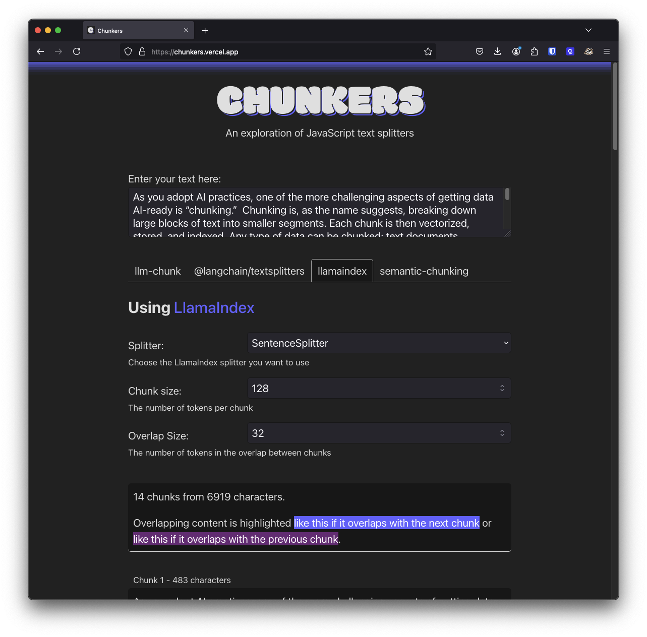 It consists of one function, chunk, and it takes just a few options. You can choose maximum and minimum sizes for the chunks it produces, pick the size of the overlap between chunks, and choose a strategy for splitting the text, either by sentence or paragraph.