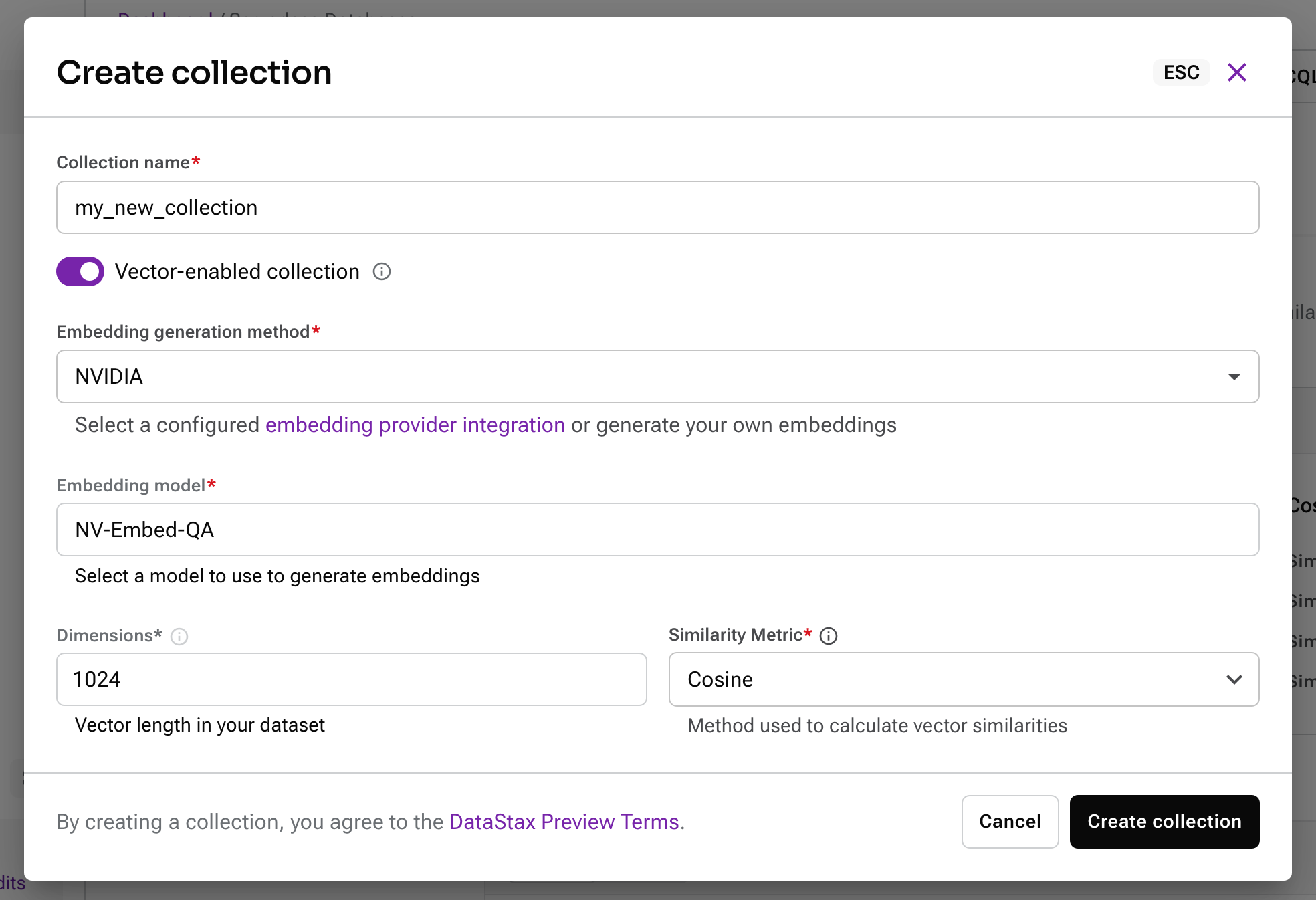 Then when you set up a collection, you can choose which embedding provider you want to use and set the correct number of dimensions.